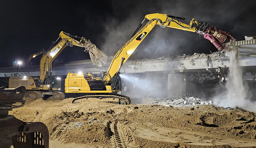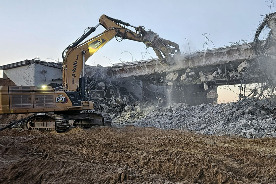 Der kürzlich durchgeführte Abbruch des Brückenbauwerks über die Autobahnen A5 und A67 am Darmstädter Kreuz – einem der stark befahrenen Verkehrsknotenpunkte Deutschlands – wurde erfolgreich und vollständig im vorgesehenen Zeitrahmen abgeschlossen. Ausgeführt wurden die Arbeiten durch die Peter Kolb GmbH, die bei diesem anspruchsvollen Projekt auf leistungsstarkes Abbruchgerät von Hydraram in Kombination mit schweren Maschinen von Caterpillar setzte.