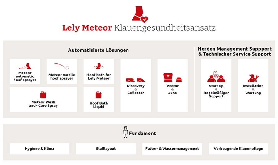 Der Lely Meteor KlauengesundheitsansatzLely Meteor ist ein innovativer Klauengesundheitsansatz für Milchviehbetriebe. Ziel ist es, die Klauengesundheit Deiner Kühe auf nachhaltige, tierfreundliche und sichere Weise zu verbessern. Dadurch wird das natürliche Verhalten Deiner Kühe unterstützt. Der Lely Meteor Ansatz basiert auf vier zentralen Säulen: Farm Management Support, Technischer Service Support, Hardware-Lösungen und Consumables. Diese vier Säulen sind perfekt aufeinander abgestimmt und bilden eine ganzheitliche Lösung für gesunde Klauen.