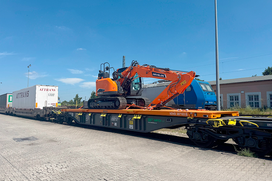 „Nach einer Phase der Forschung und Entwicklung ist unser neues S-Bolster-System nun offiziell auf die Schiene gegangen. Den Anfang machte der Transport des DX140LCR-7 von DEVELON“, sagt Martin van Dam, Gesch.ftsführer des europaweit tätigen Logistikunternehmens. Der neue intermodale Schienenverkehrsdienst für übergro.e Frachten basiert auf eigens entwickelten, patentierten Bahnplattformen wie dem S-Bolster-System. Es wurde speziell für den Transport von Geräten wie Bagger, Hubarbeitsbühnen, Landmaschinen und Wohnmobilen konstruiert, die nicht in Standardcontainer passen. „Beim Transport auf der Schiene sparen wir erheblich an Emissionen und haben dabei keine längere Transportzeit oder höhere Kosten. In naher Zukunft werden wir weitere Verfahren für den Transport höherer und breiterer Maschinen auf der Schiene entwickeln und in die Praxis umsetzen“, so Martin van Dam.
