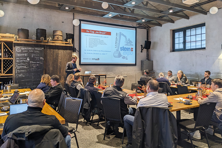 Am 4. Dezember 2025 trafen sich Verantwortliche der Geoplan GmbH sowie ausstellende Unternehmen zum Koordinationstreffen der Allgemein-Demo für die steinexpo 2026 im hessischen Nieder-Ofleiden. Erstmals in der Messegeschichte fand diese Zusammenkunft vier Monate früher als gewohnt statt. Das garantiert eine optimale Planbarkeit für alle Beteiligten.