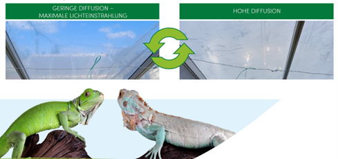 Trocknet die Folie bei Sonnenschein oder während Hitzeperioden, wird die Oberfläche diffus. Das einfallende Licht wird gestreut, wodurch die direkte Einstrahlung reduziert und ein gleichmäßigeres Klima im Inneren geschaffen wird. Das schützt die Pflanzen vor Überhitzung – für gesünderes Wachstum und eine effizientere Nutzung der Sonnenenergie.