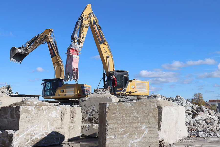 Geballte Cat Technik ist zugange, um den Abbruch voranzutreiben. Das Team rund um einen Cat 336, einen Cat 330 und einen Cat 330 FLN ist eingespielt. Es erhielt aber soeben weitere Verstärkung in Form eines Cat 340, geliefert von der Zeppelin Niederlassung Ulm und Gebietsverkaufsleiter Uwe Fuhrmann sowie Serviceberater Joachim Steck. Dank der Straight-Boom-Ausführung kommt der Kettenbagger auf bis zu 14 Meter Reichweite aufgrund seines geraden, ausfahrbaren Arms ohne Zusatzgelenk. Damit lassen sich Gebäude rückbauen, die Hafner Baumgartl als Bauprojekte im Blick hat.