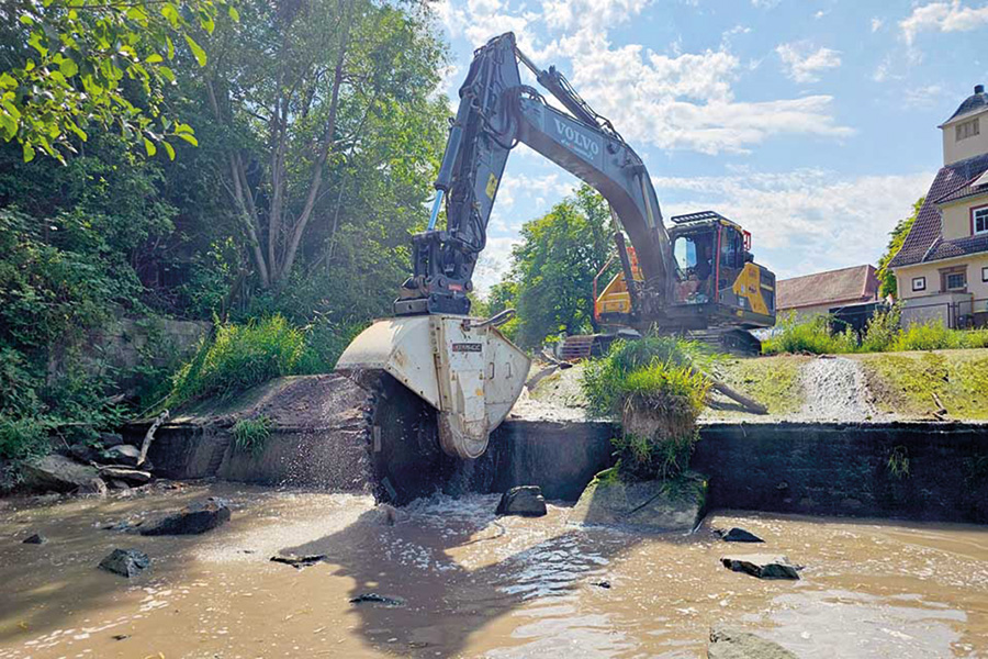 Eine ausgediente Wehranlage in Stadtilm (Thüringen) wurde zurückgebaut, um den städtischen Abschnitt des Flusses Ilm wieder für Fische passierbar zu machen. Beim Zerkleinern der mächtigen Wehrschwelle verwendete das Unternehmen JeFra Bauservice GmbH & Co. KG ein KEMROC-Schneidrad DMW 220 an einem 32-t-Hydraulikbagger. Damit gelang es, den Betonkörper präzise, wirtschaftlich und ohne schädliche Erschütterungen zu zerlegen.