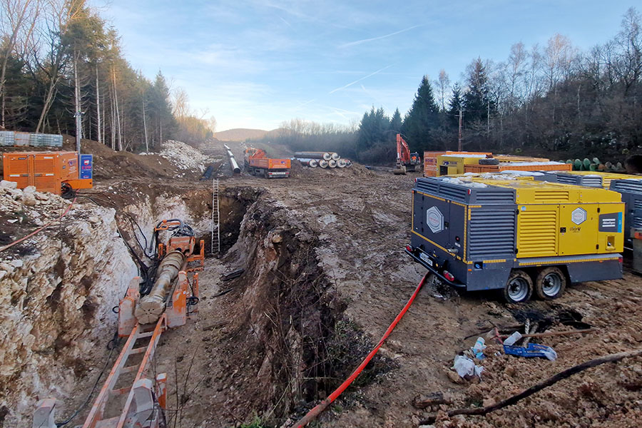 Bei zwei anspruchsvollen Pipeline-Baustellen in Kroatien setzte das Rohrleitungs- Bauunternehmen Petzold auf besondere Technik: Mit einem Geonex-Hammerbohrgerät und mehreren Atlas-Copco-Kompressoren gelangen die etwa 100 m langen Bohrungen trotz extremer Bodenverhältnisse. Um den hohen Luftbedarf von bis zu 150 m³/min bei 25 bar zu decken, kombinierte Petzold eigene Großkompressoren mit zusätzlichen Mietaggregaten. Zwei Schlüssel zum Erfolg: die enge Zusammenarbeit mit dem Vermietungspartner Kleinstück und die perfekte Abstimmung von Hydraulik, Hammerbohrer und Druckluftversorgung.