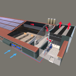 Das Wärmerückgewinnungssystem nutzt den Luftwäscher als Wärmetauscher. Die verunreinigte, warme Betriebsluft wird über einen separaten Kanal abgeleitet und erwärmt das Prozesswasser. Das erwärmte Brauchwasser wird mit einer Pumpe über einen Plattenwärmetauscher geleitet. Hier wird die Wärme auf die Reinwasserseite des Systems übertragen. Dieses heiße Wasser wird dann direkt zu einem Wärmetauscher im Lufteinlass des Stalls geleitet. Dadurch erwärmt sich die einströmende Luft um bis zu 15 Grad.