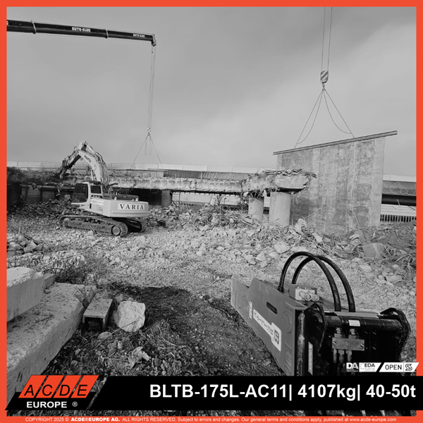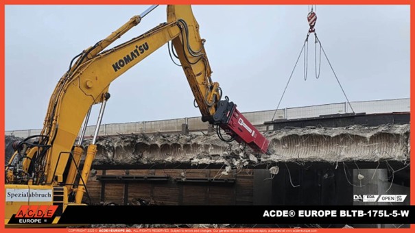 Im Rahmen dieser Arbeiten kommt ein ACDE® Europe BLTB-175L-5-W Hydraulikhammer zum Einsatz. Es handelt sich dabei um den ersten Hydraulikhammer von ACDE® Europe im Maschinenpark des ausführenden Unternehmens und zugleich um einen wichtigen Schritt in Richtung einer weiterführenden Zusammenarbeit.