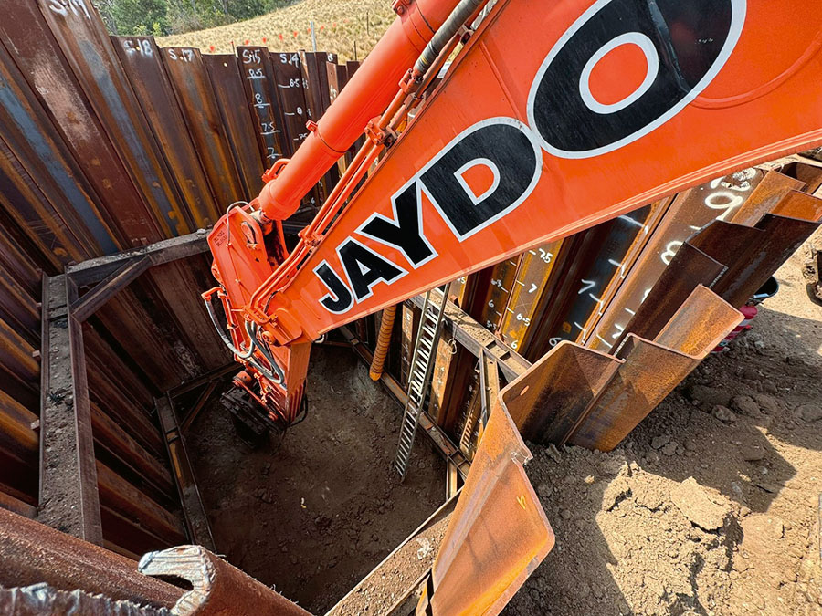 Bei den Arbeiten kamen zwei Indeco-Hämmer zum Einsatz: ein HP 12000, der auf einem 69 Tonnen schweren Hitachi-Bagger montiert war, um bis zu 11 Meter tief zu graben, und ein HP 9000, für den Jaydo mit Unterstützung des Indeco-Teams und von South East Engineering eine Erweiterung entwarf, die es ermöglichte, den Aushub um weitere 3 Meter fortzusetzen, um die geplanten 15 Meter zu erreichen.