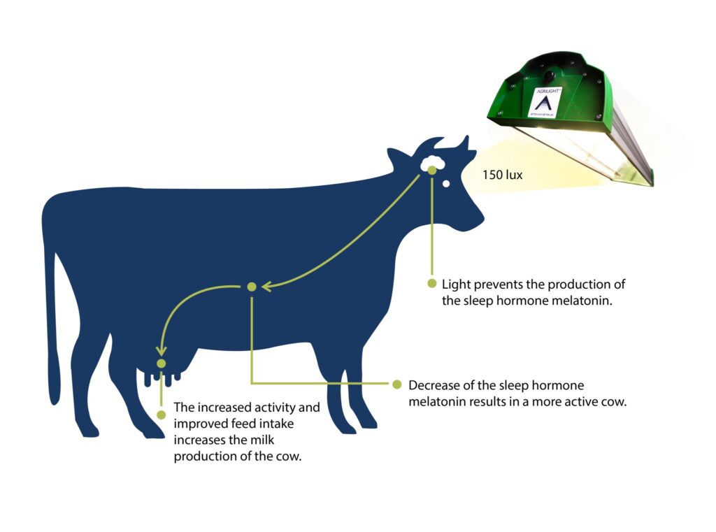 • 7-8% more milk: Research shows that cows under this lighting schedule yield significantly more milk thanks to suppressed melatonin (the “sleep hormone”) and improved hormonal balance.