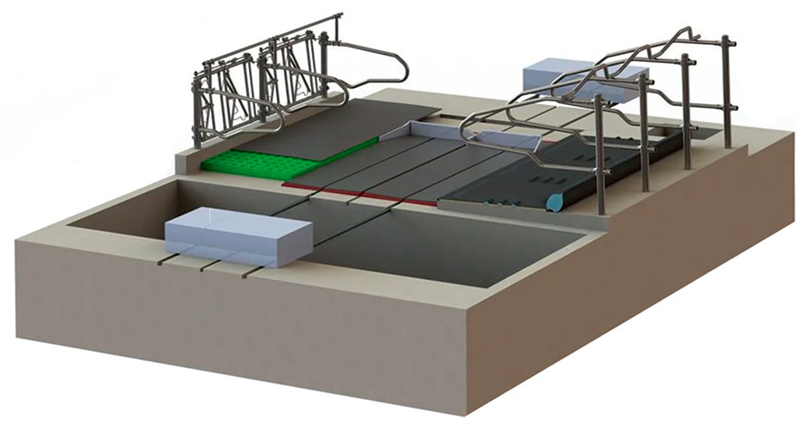The Delta-X barn floor consists of rubber floor components with 3% slopes created on either side of the channels in the alley. Conveyors belts are mounted between the channels. Gravity guides the urine down the slope to the conveyor belt.