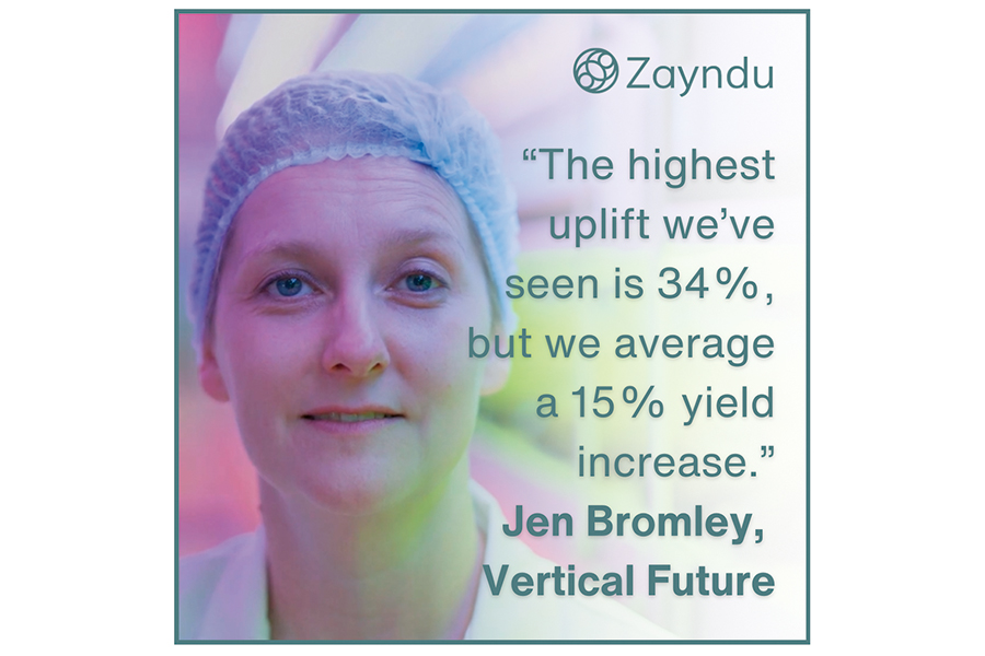 Jen Bromley, chief scientific officer for Vertical Future, has witnessed significant improvements in leafy green yields. The biggest was a 34% yield increase in a commercial lettuce crop.