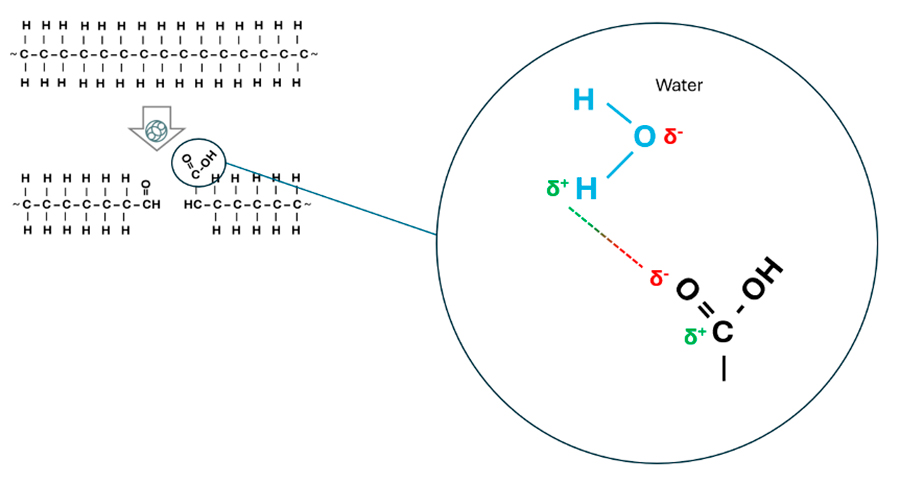 Carboxyl groups are polar, exhibiting slight charge imbalances. Since water is also polar, the minor charges on both the seed coat and water molecules facilitate a chemical attraction, rendering the seed more hydrophilic. Consequently, it is easier for water to adhere to the seed’s surface.