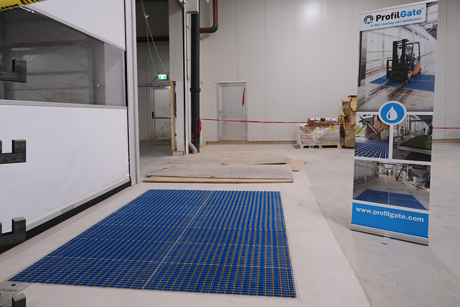 The system consists of stainless steel bins built into the floor. The bins have a depth of 4.5 cm and the floor under the bins must be 100% level. In this bin are 16 grids with parabolic brushes. By driving over the brushes, the brushes are pressed into the disinfection liquid and the liquid rises to the top through the moving bristles. This cleans the tyre and disinfects at the same time. The ProfilGate system is not otherwise mechanical all that is needed here is a drain per bin to clean it. And is ideal for cleaning wheels and very hard-wearing.