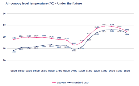The fixtures were switched on between 00:00 to 5:00 pm. The beneficial LEDFan effect was most visible between 00:00 and 9:00 am.