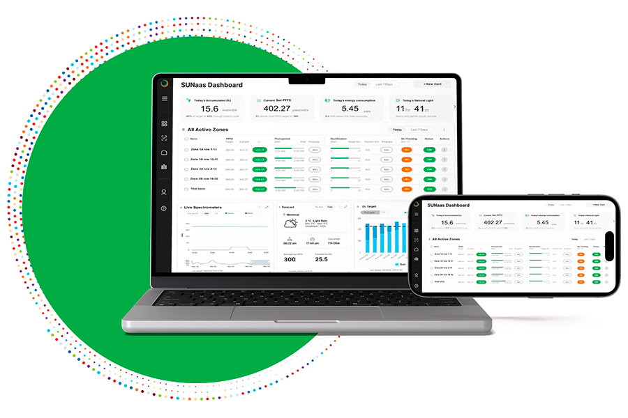 By integrating with Sollum’s proprietary SUN as a Service® platform, Optimal’s AI anticipates the impact of light and balances it with climate and irrigation in real time. Optimal’s AI seamlessly updates settings in the grower’s existing control computer. The result for growers is a fully automated system that precisely executes their growing strategy 24/7 across lighting, climate, and irrigation.