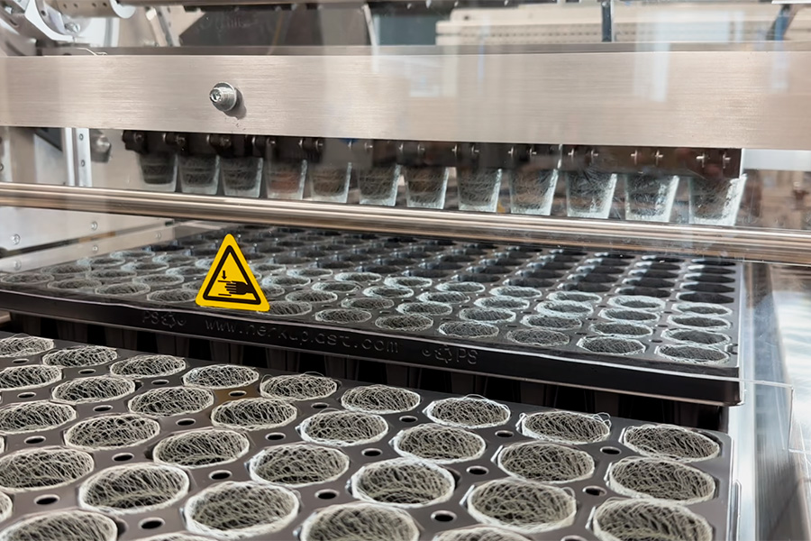 These latest filling machines are available in a semi-automatic or fully automatic version. The dispenser in the Basic line works with a drop chute. The automatic Advanced dispenser is currently undergoing final testing to further optimise its integration into existing automatic tray filling lines. The focus here is on precision in the filling process for the Growcoon into the trays and increasing the throughput capacity in conjunction with high line speeds.