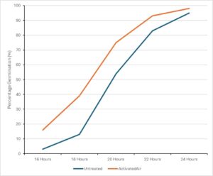Figure 1. Germination Testing of Lettuce. The graph follows the germination process of untreated seeds and ActivatedAir-treated seeds, over a span of 24 hours.