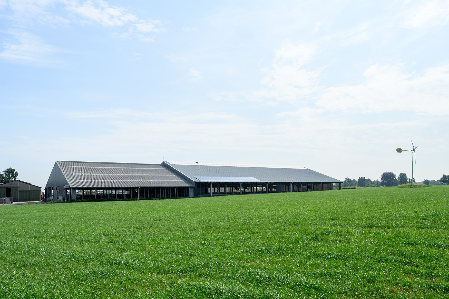 Het dak is opgebouwd met 𝗴𝗲ï𝘀𝗼𝗹𝗲𝗲𝗿𝗱𝗲 𝗲𝗰𝗼𝗽𝗮𝗻𝗲𝗹𝗲𝗻, die zorgen voor een aangenaam stalklimaat. Voor de ventilatie werd gekozen voor grote windzeilen in combinatie met een open oversteeknok, wat zorgt voor een natuurlijke luchtcirculatie.