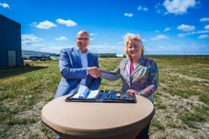 Bleiswijk, 22 mei 2025 – In Bleiswijk zet Wageningen University & Research (WUR) opnieuw de toon in de internationale glastuinbouwsector. De universiteit, wereldwijd geroemd om zijn agrofood-onderzoek, laat een ultramodern onderzoekscentrum van 8.700 m² bouwen door kassenbouwer Bom Group. Het complex wordt hét nieuwe epicentrum voor tuinbouwinnovatie. Vandaag zetten Monique van Wordragen (BU manager glastuinbouw bij WUR) en Rob de Wit (commercieel manager bij Bom Group) officieel hun handtekening onder het project. In het complex zullen vanaf eind volgend jaar nieuwe technieken en duurzame oplossingen worden ontwikkeld die de wereldwijde voedselproductie toekomstbestendig maken.