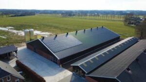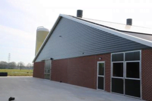 Daarnaast zijn geïsoleerde PIR wandpanelen en lichtdoorlatende dakpanelen toegepast, wat zorgt voor een natuurlijke lichtinval en een gezonder stalklimaat.