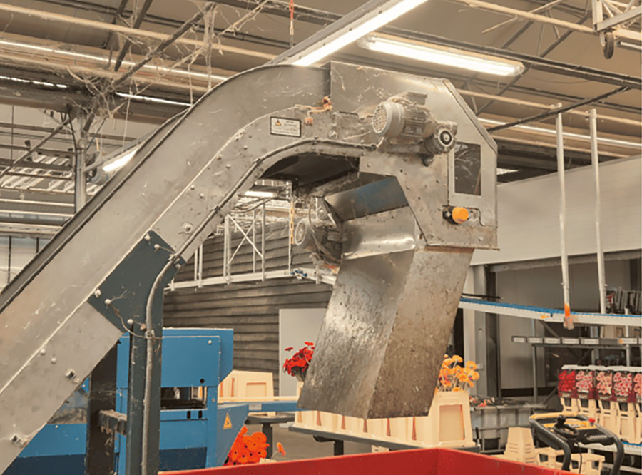 Het systeem is ontworpen om (snij)afval direct vanaf de elevator te verwerken. Het afval wordt vermalen, waardoor het volume gereduceerd wordt en u meer afval kwijt kunt per kist of container. Ook is hiermee het groenafval beter te verwerken voor een perscontainer.
