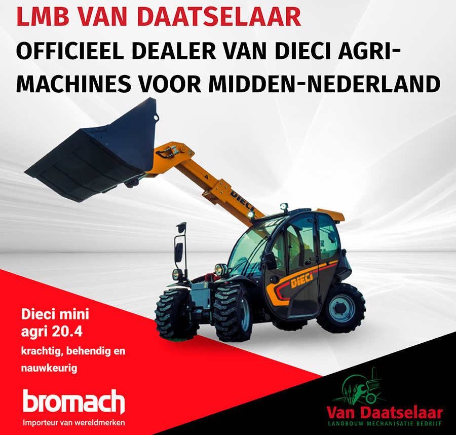 DIECI Nederland, onderdeel van Bromach B.V. en importeur van DIECI agri- en constructiemachines, heeft Landbouw Mechanisatiebedrijf Van Daatselaar uit Leusden per direct aangesteld als officieel dealer voor Midden-Nederland. LMB Van Daatselaar neemt het dealerschap van de DIECI agri-machines op zich. De constructiemachines blijven in deze regio vertegenwoordigd door Roseboom Mechanisatie (Lunteren). Met deze uitbreiding versterkt Bromach/DIECI Nederland de positie van DIECI in Midden-Nederland. Voor klanten betekent dit een breder en innovatiever aanbod, gecombineerd met de vertrouwde service van LMB Van Daatselaar.