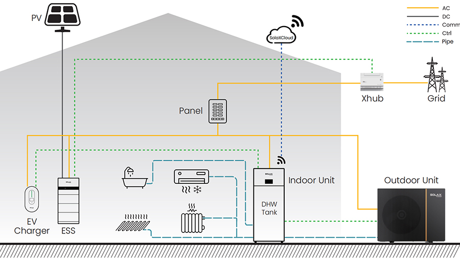Het energieopslagplatform van SolaX vormt het hart van het systeem. Het verbindt zonne-energieopwekking, huishoudelijk energieverbruik en nettoegang. Daarnaast coördineert het de werking met een slim laadstation voor elektrische voertuigen en een lucht-water warmtepompsysteem. De configuratie van de warmtepomp omvat een buitenunit en een binnen unit met een boiler voor sanitair warm water. Het ondersteunt verwarming van de leefruimte, koeling en de levering van warm water voor sanitair gebruik. Door middel van geïntegreerde communicatie en besturing kunnen de verwarmings- en laadbehoeften worden afgestemd op de beschikbare zonne-energie en de opslagcapaciteit.